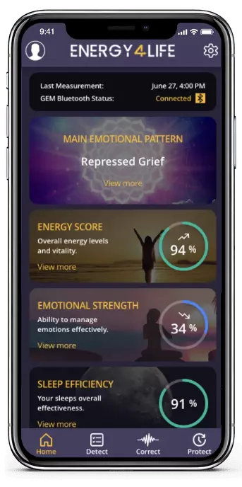 By analyzing the entire shape of your pulse wave and other biometric data, the GEM provides insight into your energy levels, emotions, and sleep efficiency, allowing you and your GEM device insight into what to Correct and Protect.